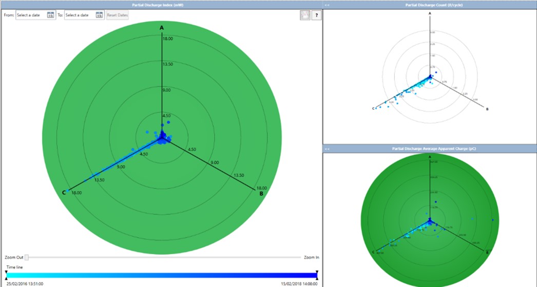 Using the same bushing adaptors, the DGA 900 PLUS offers the added advantage of measuring high frequency signals in order to monitor PD activity, giving an added level of protection for the main tank of the transformer. The amplitude of the PD pulses are recorded and used to calculate an overall measure of PD activity. Several methods are used to discriminate between internal PD and external noise (corona discharge). The BMT 330 also provides Partial Discharge Phase Resolve (PDPR) diagnostics.