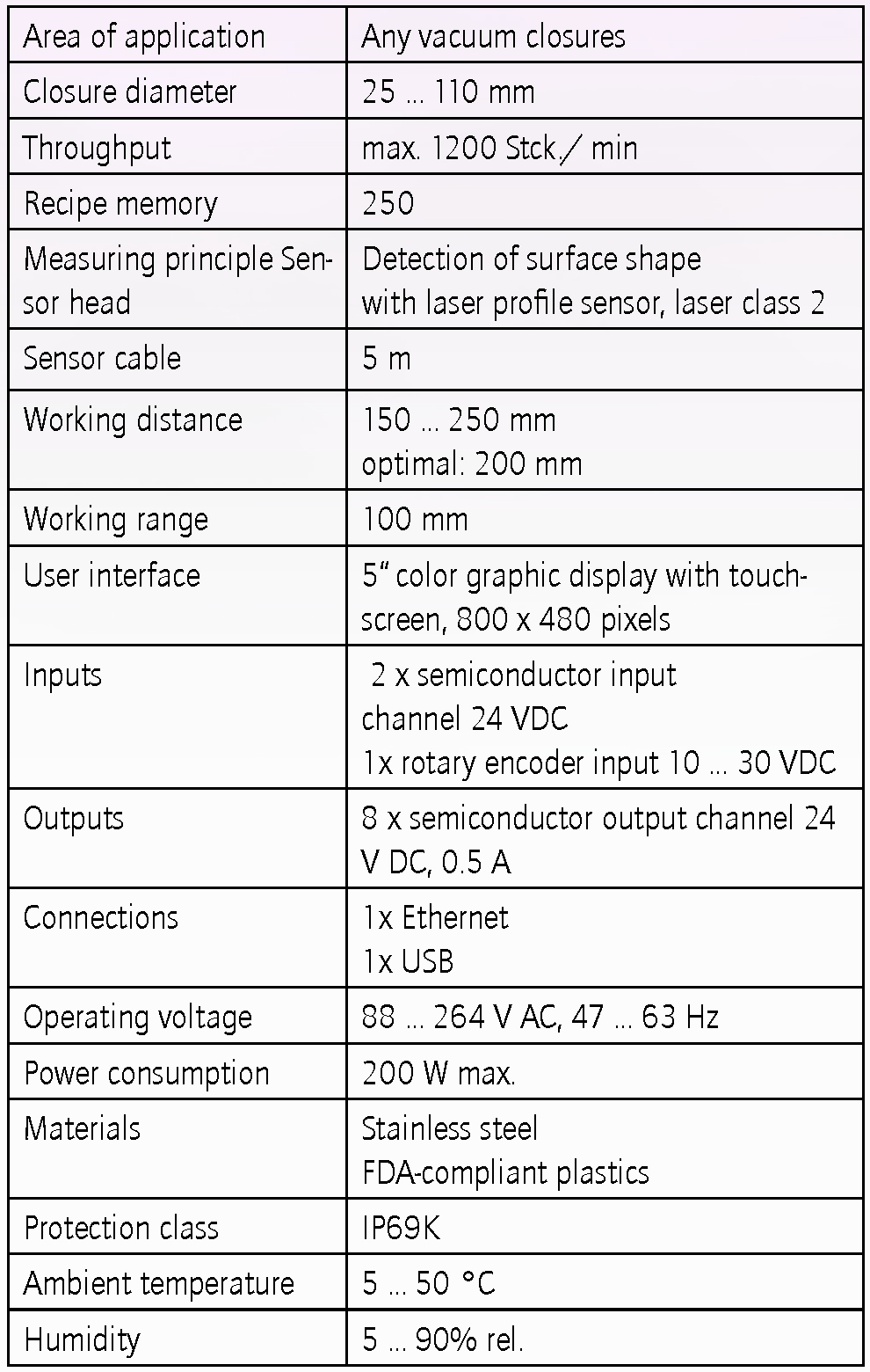 With the help of a profile sensor, all common closures can be reliably measured with a vacuum, regardless of material, color, and surface structure. The large working range of 100 mm usually allows recipe changes without readjusting the sensor head.