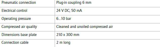 其控制與調整皆由中央單元完成,組成包括氣動閥與氣缸、含手動關閉閥的壓縮空氣處理單元、含濾網的壓力調節器及可調式固定支架