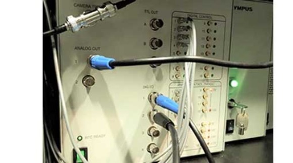 圖 3:來自 Elveflow OB1 壓力驅動流量控制器控制箱(右)和通過 BNC 電纜連接的 RTC Olympus 顯微鏡實時控制器(左)的 TTL 端口的圖片。