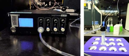 圖 4:Elveflow OB1 壓力驅動流量控制器(左)和連接到 OB1 的水庫的圖片,其中包含通過微流控芯片注入的溶液的管道。