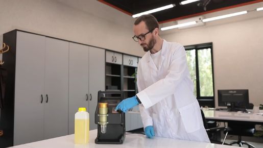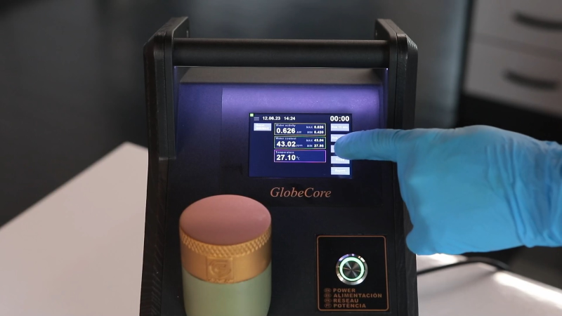 在下圖中,您可以看到使用 GlobeCore TOR-1 設備測量溶解在變壓器油中的水分含量的過程。要獲得結果,必須取樣被測絕緣油並倒入測試容器中,並將其連接到設備上,然後按下 "開始 "按鍵。隨後,設備將在彩色顯示器上顯示以百萬分之一(ppm)為單位的水分含量數值。如有需要,可通過內建熱感式印表機列印出測試結果。
