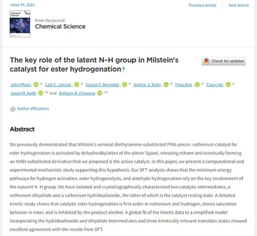 Pham, J.; Jarczyk, C. E.; Reynolds, E. F.; Kelly, S. E.; Kim, T.; He, T.; Keith, J. M.;* Chianese, A. R.* “The Key Role of the Latent N-H Group in Milstein’s Catalyst for Ester Hydrogenation,” Chem. Sci., 2021, 12, 8477-8492. https://doi.org/10.1039/D1SC00703C