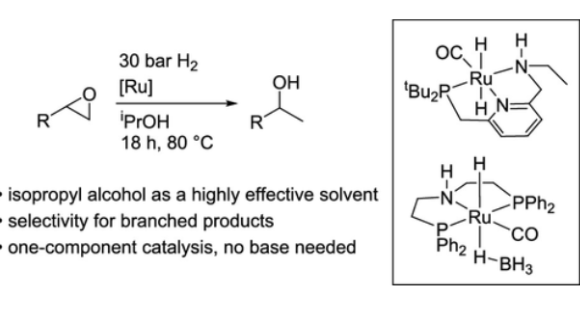 點擊閱讀化學家 David Milstein 教授發現這類型催化劑常用於化學品生產的過程,開發這些催化過程在化學工業經濟扮演著可持續增長的重要改進領域。米爾斯坦催化劑(Milstein catalysts)可應用在含鉗形配體(Pincer Lihands)的過渡金屬絡合物來活化元素之間的共價鍵。科爾蓋特大學的化學家最初確定含PNN-鉗形配體的釕絡合物是無活性的,在鉗形配體脫氫烷基化後(dehydroalkylation),形成有活性 NHEt 取代的衍生物,副產物為乙烷或丙烷。這表明產生的N-H 基團是催化活性的關鍵,迎來發現了迄今為止已知的最活躍的酯加氫催化劑。在另一項研究中,通過對 PNN- 和 PNP- 釕鉗絡合物的實驗(PNN- and PNP- ruthenium pincer complexes),以異丙醇作為溶劑和不需用強鹼的情況下,低催化劑負載量可用於提高環氧化物的選擇性氫解(hydrogenolysis of epoxides),他們能夠從 PNP-鉗形絡合物 Ru-MACHO-BH(一種市售催化劑,比測試的替代催化劑便宜)中以最少的催化劑量生產高產率的支化醇(branched alcohol)。