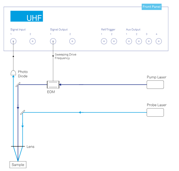 其中,泵浦光源通常利用電-光調製器(EOM)進行 0.2 - 20 MHz 頻率範圍內的調製。隨後,泵浦光源透過物鏡匯聚到樣品表面。